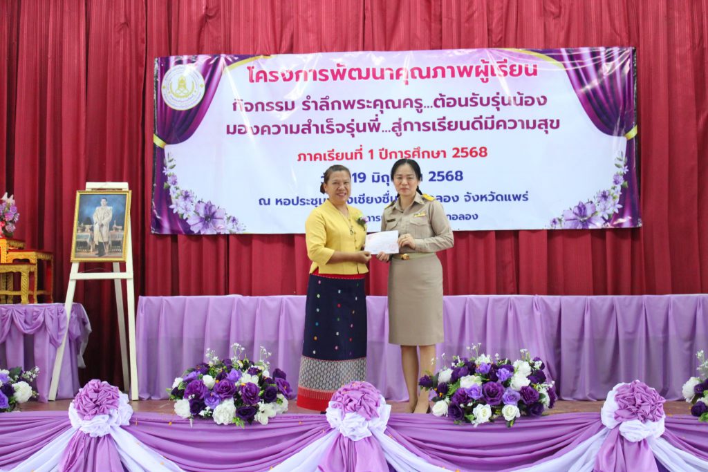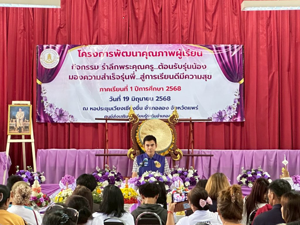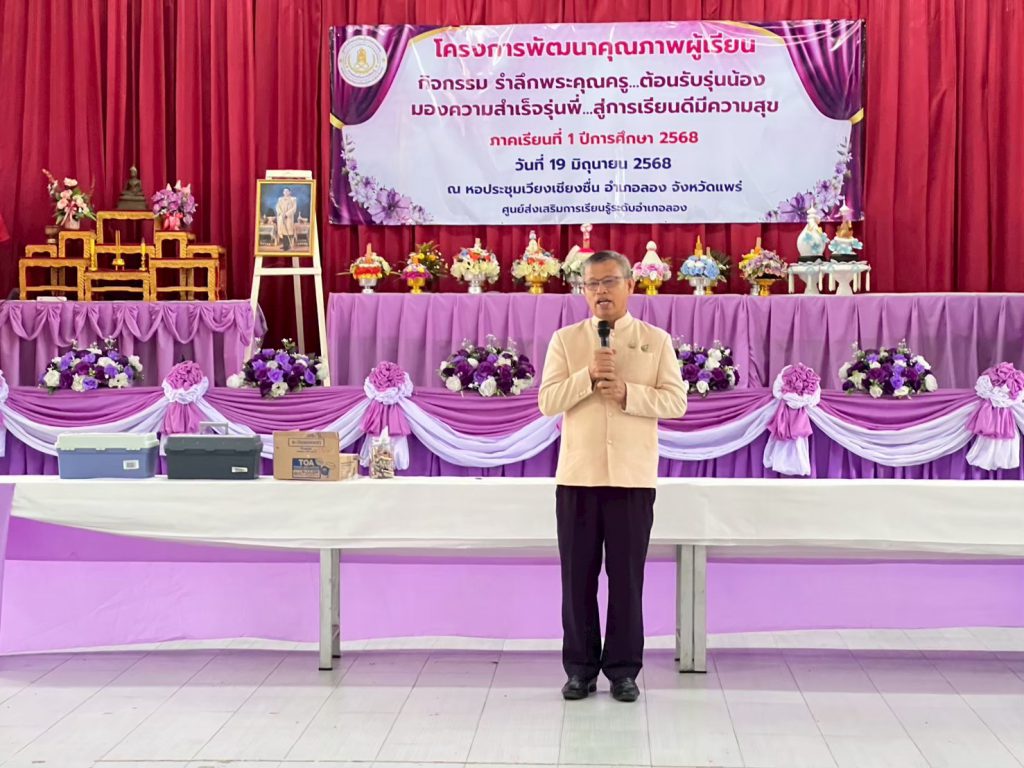 นางอัจจิมา วรรณเลิศ ครู รักษาการในตำแหน่ง ผอ.สกร.ระดับอำเภอลอง พร้อมด้วยคณะครูและบุคลากร สกร.ระดับอำเภอลอง จัดโครงการพัฒนาคุณภาพผู้เรียนกิจกรรมรำลึกพระคุณครู ต้อนรับรุ่นน้องมองความสำเร็จรุ่นพี่สู่การเรียนดีมีความสุข ภาคเรียนที่ 1 ปีการศึกษา 2568 โดยมีฐานการเรียนรู้ดังนี้